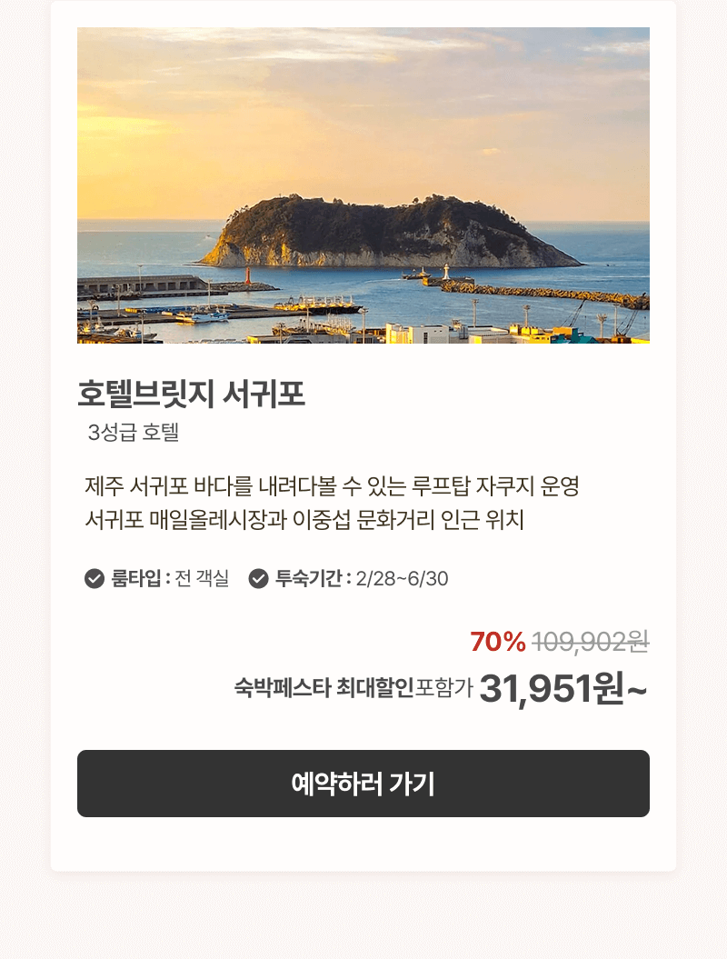 - 호텔브릿지 서귀포: 제주 서귀포 바다를 내려다볼 수 있는 루프탑 자쿠지 운영, 최대 70% 할인