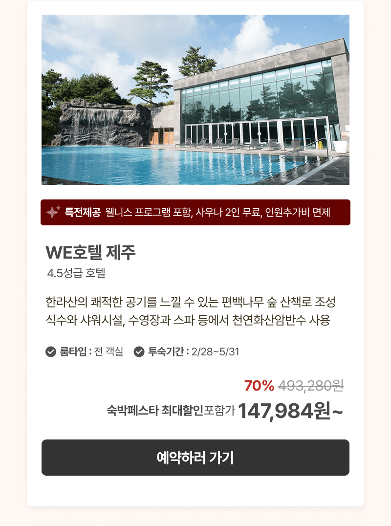 - WE호텔 제주: 한라산의 쾌적한 공기를 느낄 수 있는 웰니스 호텔, 사우나 2인 무료 제공, 최대 70% 할인