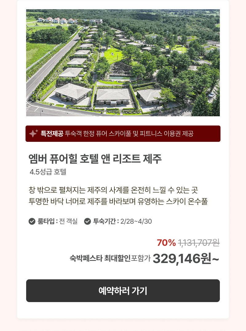 - 엠버 퓨어힐 호텔 앤 리조트 제주: 제주 자연을 만끽할 수 있는 프라이빗 리조트, 투숙객 한정 스카이풀 이용권 제공, 최대 70% 할인