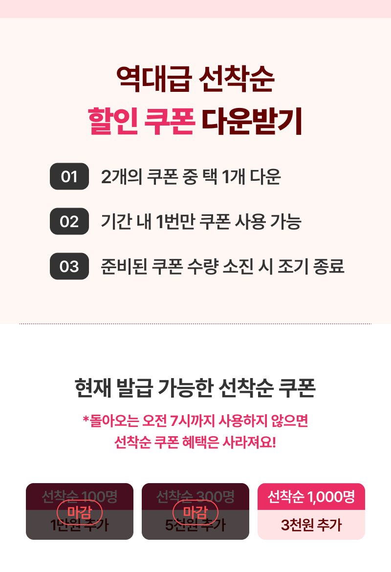 - 쿠폰 유효기간: 매일 오전 10시 ~ 다음날 오전 7시 (사용하지 않으면 자동 소멸)